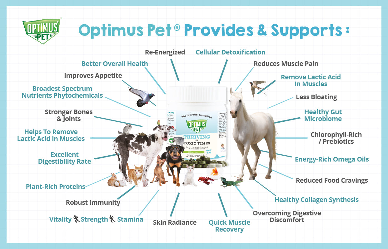 "Optimus Pet helps to complete your pet’s diet, providing a natural and wholesome source, Micro-Algae, the most Nutrient-Dense pet food on earth!"