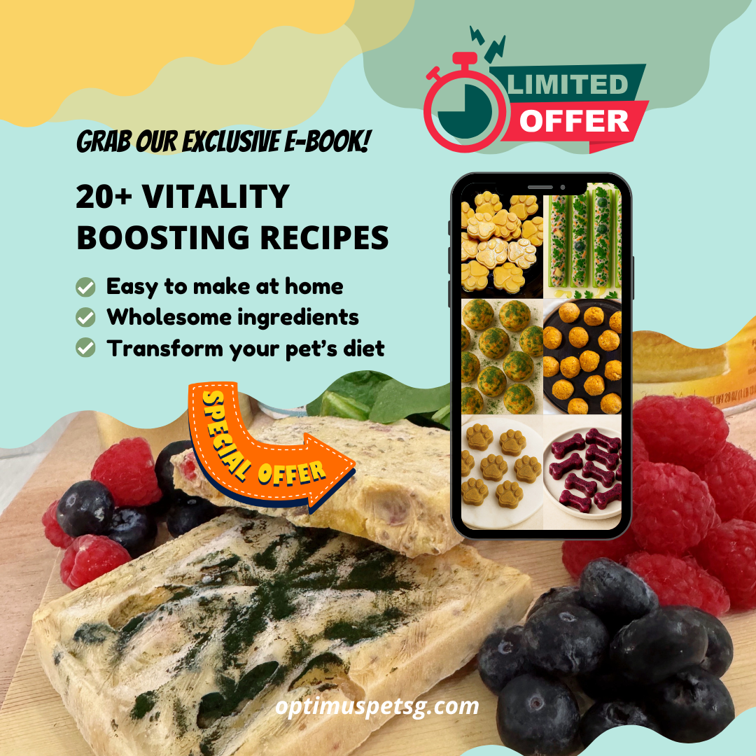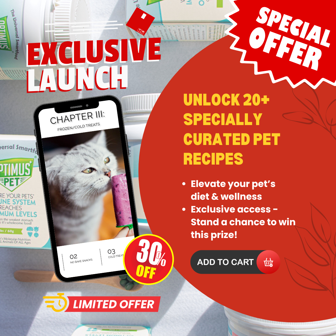 Give your pet the gift of health and happiness with our 44-page Optimus Pet e-Cookbook — packed with 20 delicious, vet-approved recipes you can make right at home. Whether your pet needs nutrient-boosting add-ons, fun snacks, or cooling treats, this cookbook makes it simple and enjoyable.