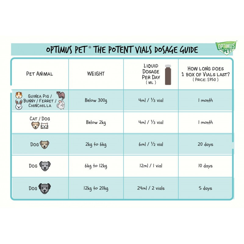 Unlike isolated vitamins, there is no real fixed dosage for vegetable source food like Optimus Pet®. You gradually increase serving size according to your pet's comfort level.